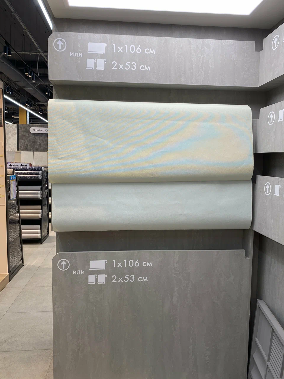 В магазине много удобных штук: наклеенные франменты обоев сверху, «примерочная» обоей с регулировкой освещения.