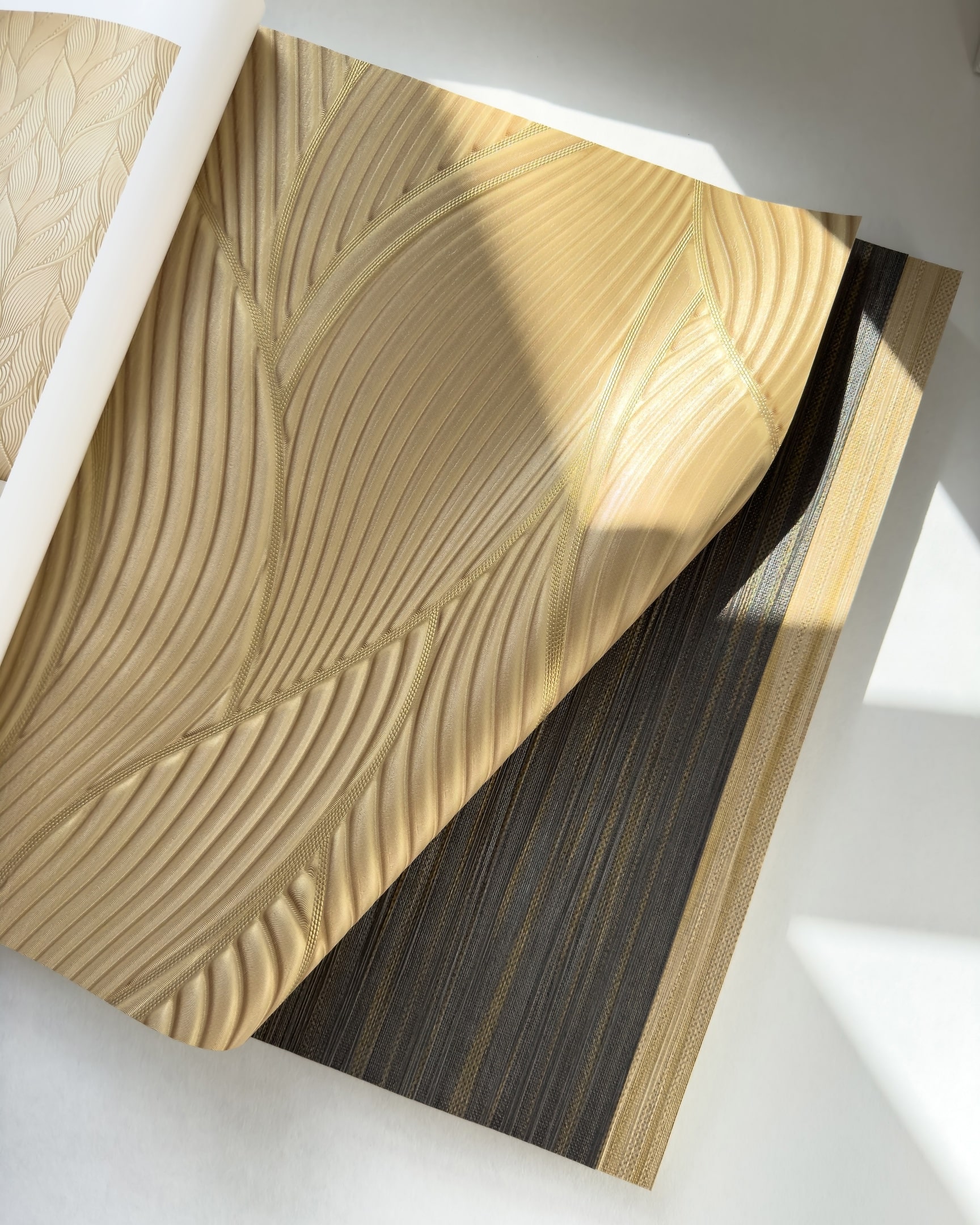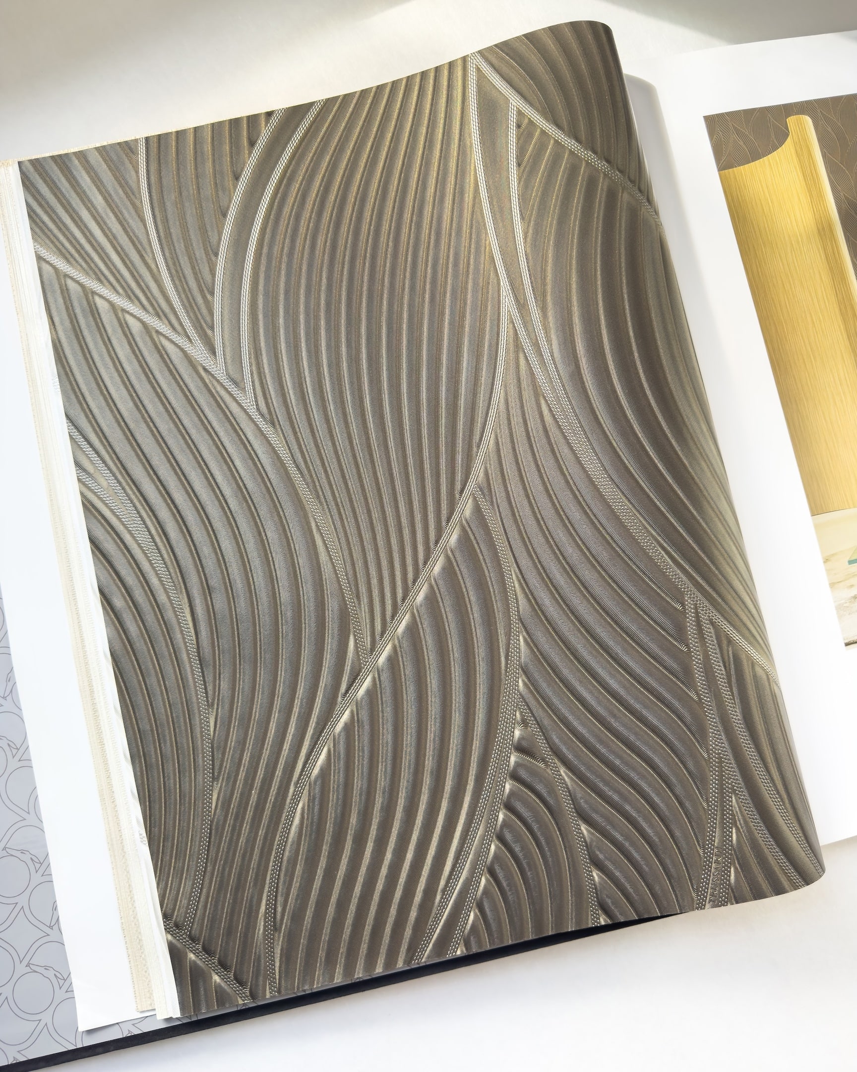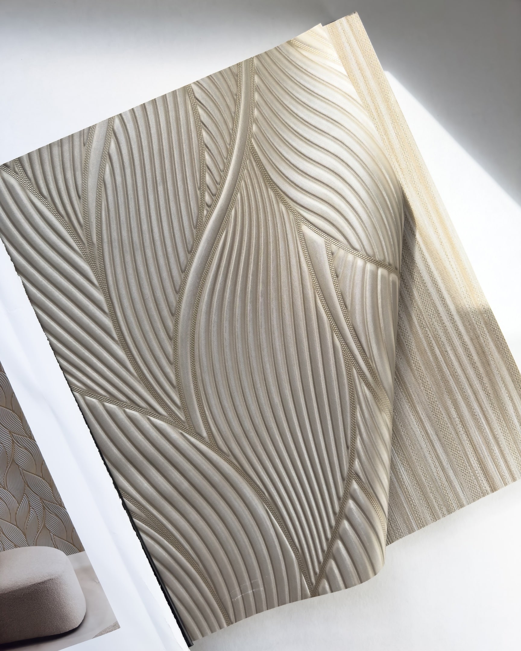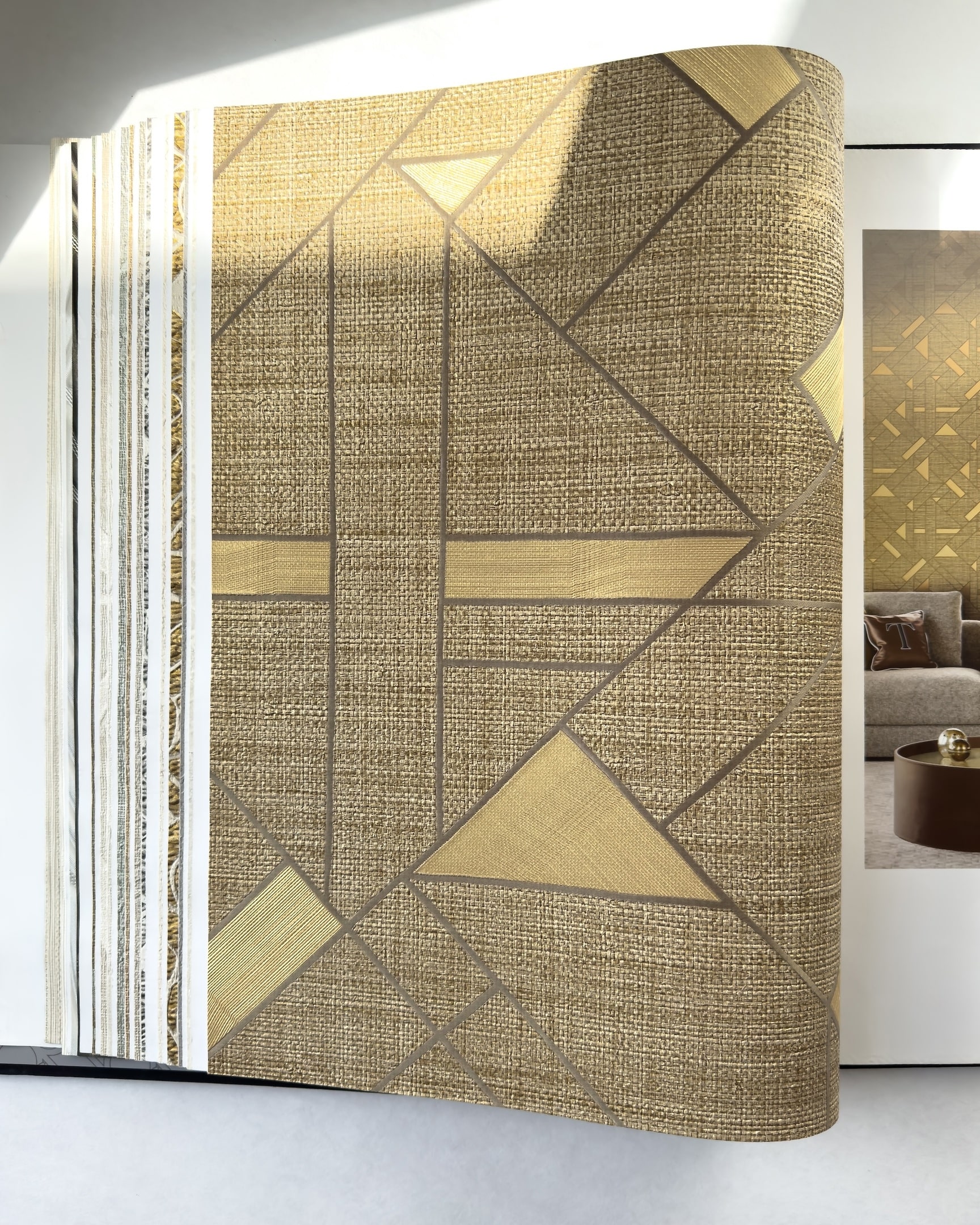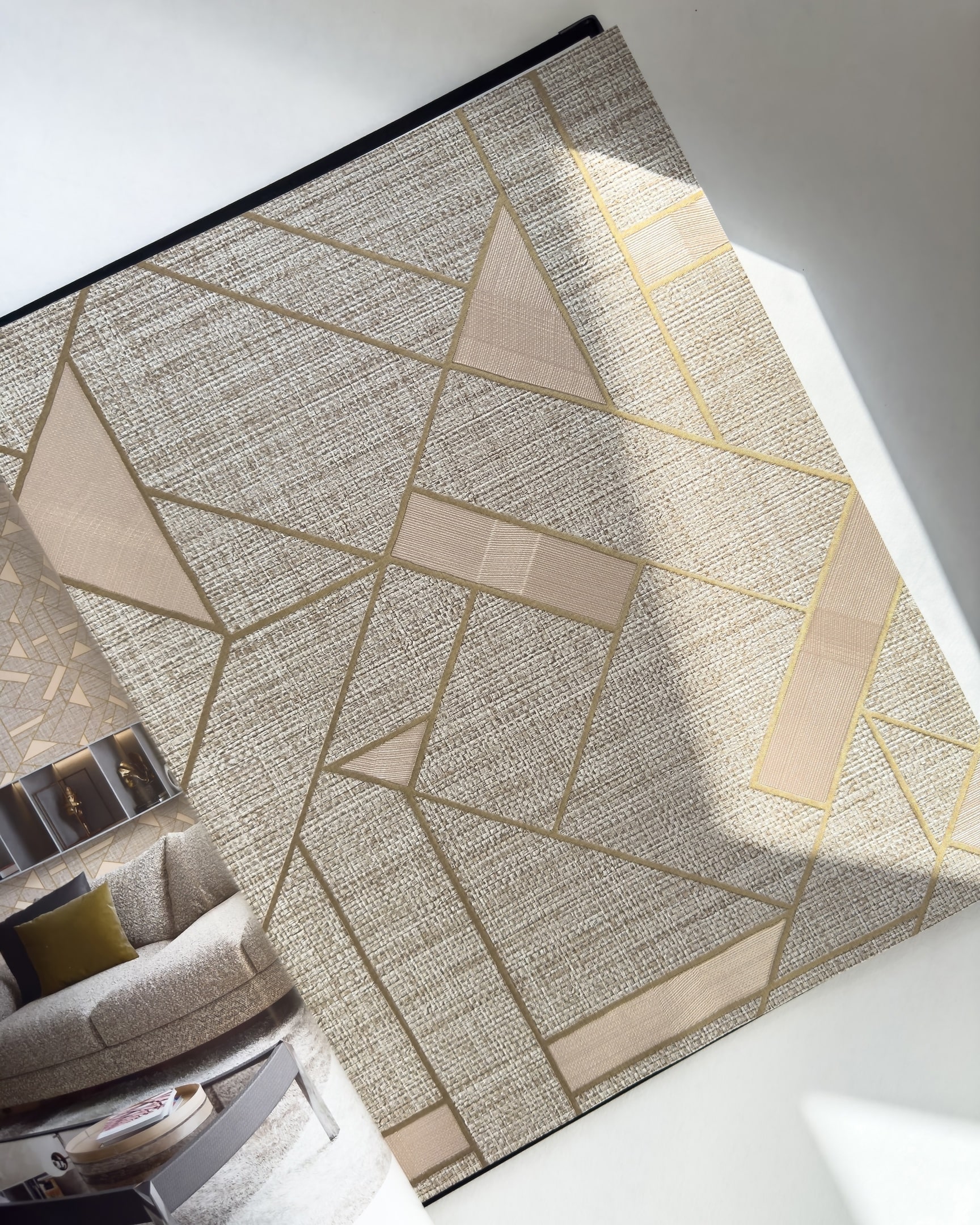 Коллекция Trussardi 7 возникла в результате сотрудничества двух итальянских брендов: модного дома Trussardi и обойной фабрики Zambaiti Parati. Для обоев выбрана беспроигрышная цветовая гамма: золотые, серебряные и бежевые тона, которые выглядят презентабельно и сдержанно. Полотна имеют объем, особенно это касается рисунка с листьями, который выглядит как объемные панели. Чтобы придать классическому дамаску современный вид, его замиксовали с грубой рогожкой, а рисунок тропических листьев соединили с геометрией и также фактурой ткани.