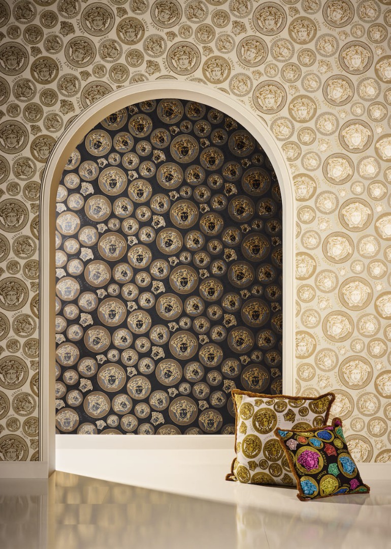 Великолепный набивной рисунок, много золота и дорогие материалы — это фирменный знак Versace, такой же, как и уже почти ставшие символом классики декоры Greek Key и Barocco.