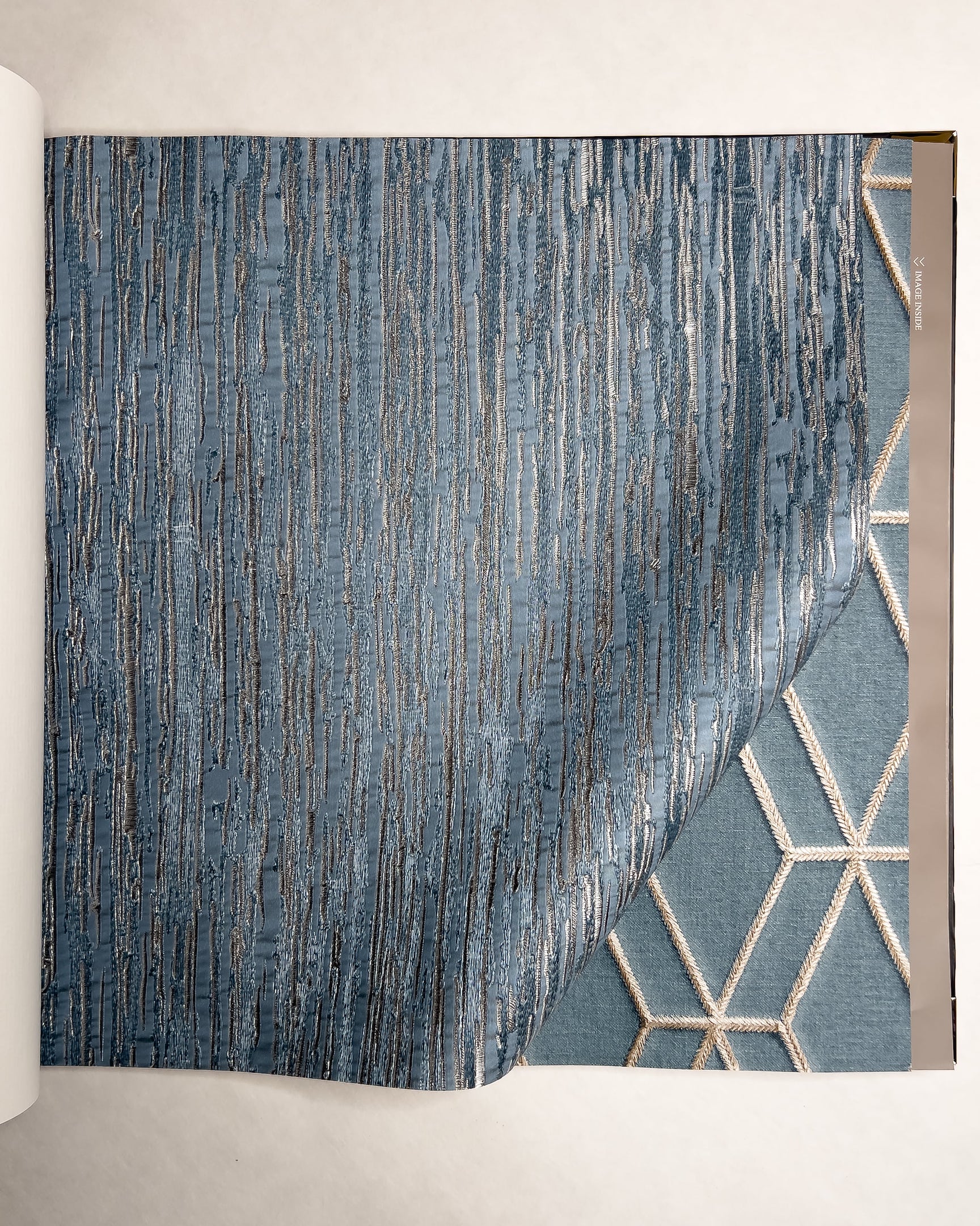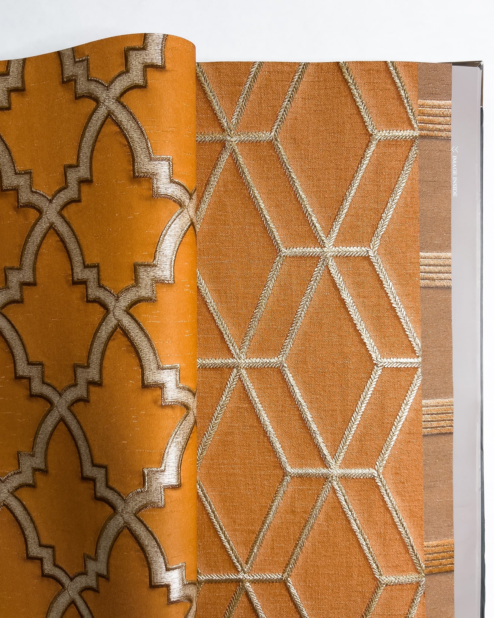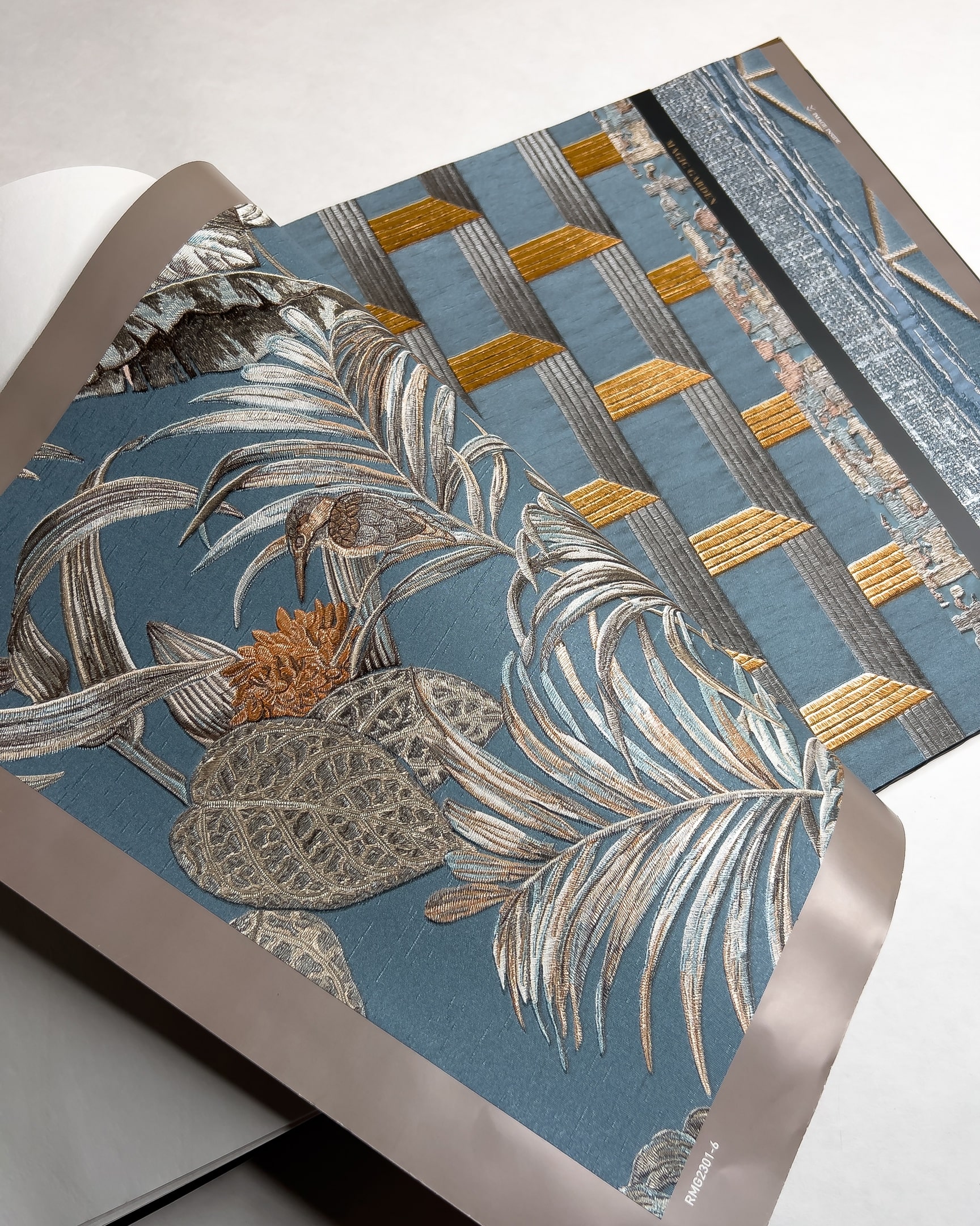Коллекция от бренда Solo с эффектом вышивки. Основа выглядит как атласное или шелковое полотно на котором «вышиты» ромбы, рисунок «решетка», серебристые нити или многоцветные птицы в окружении растений. Каталог представляет собой визуальное отражение роскошного сада, где есть и изящные ограды, и богатая растительность.