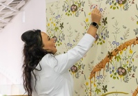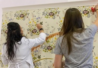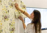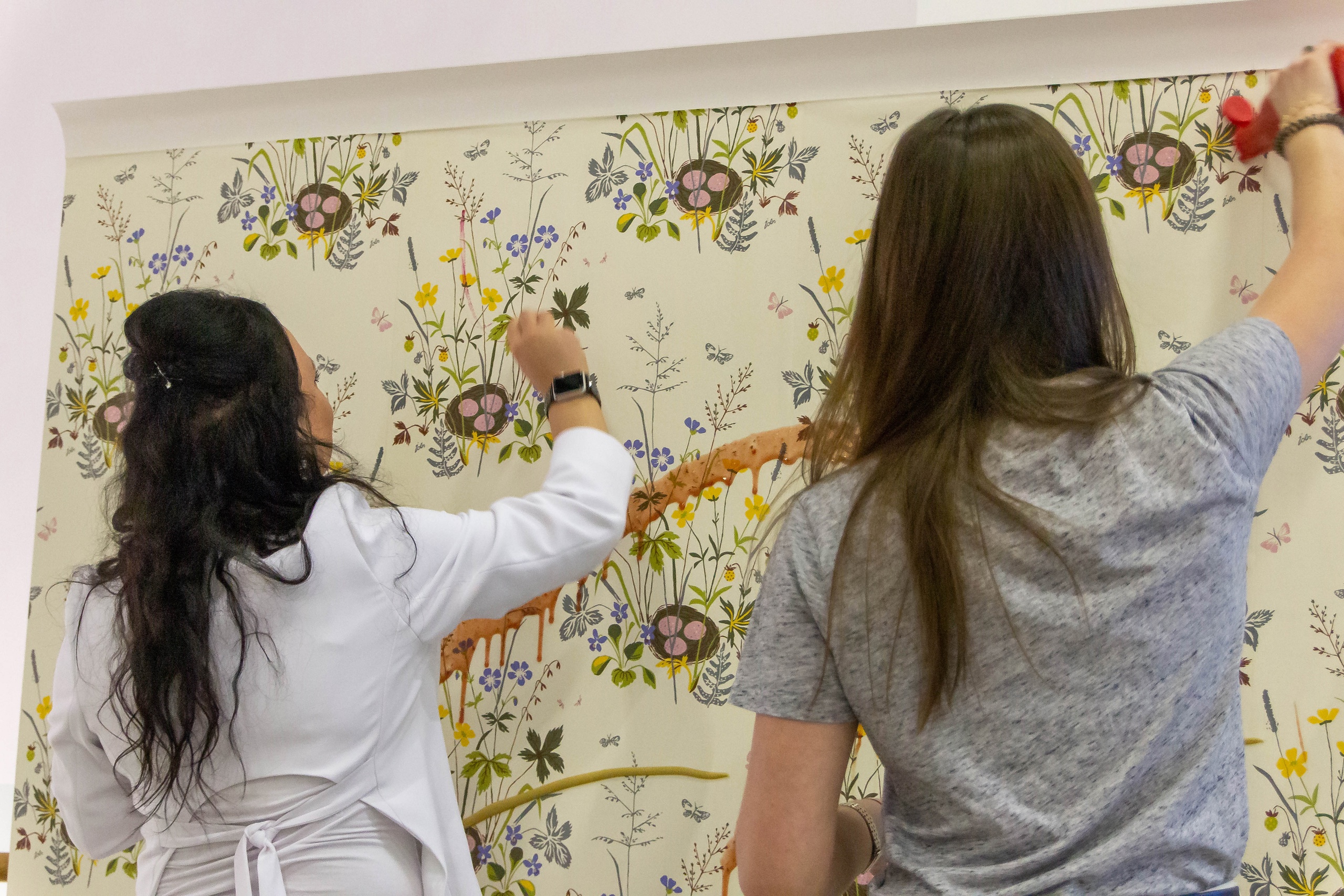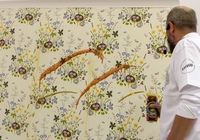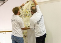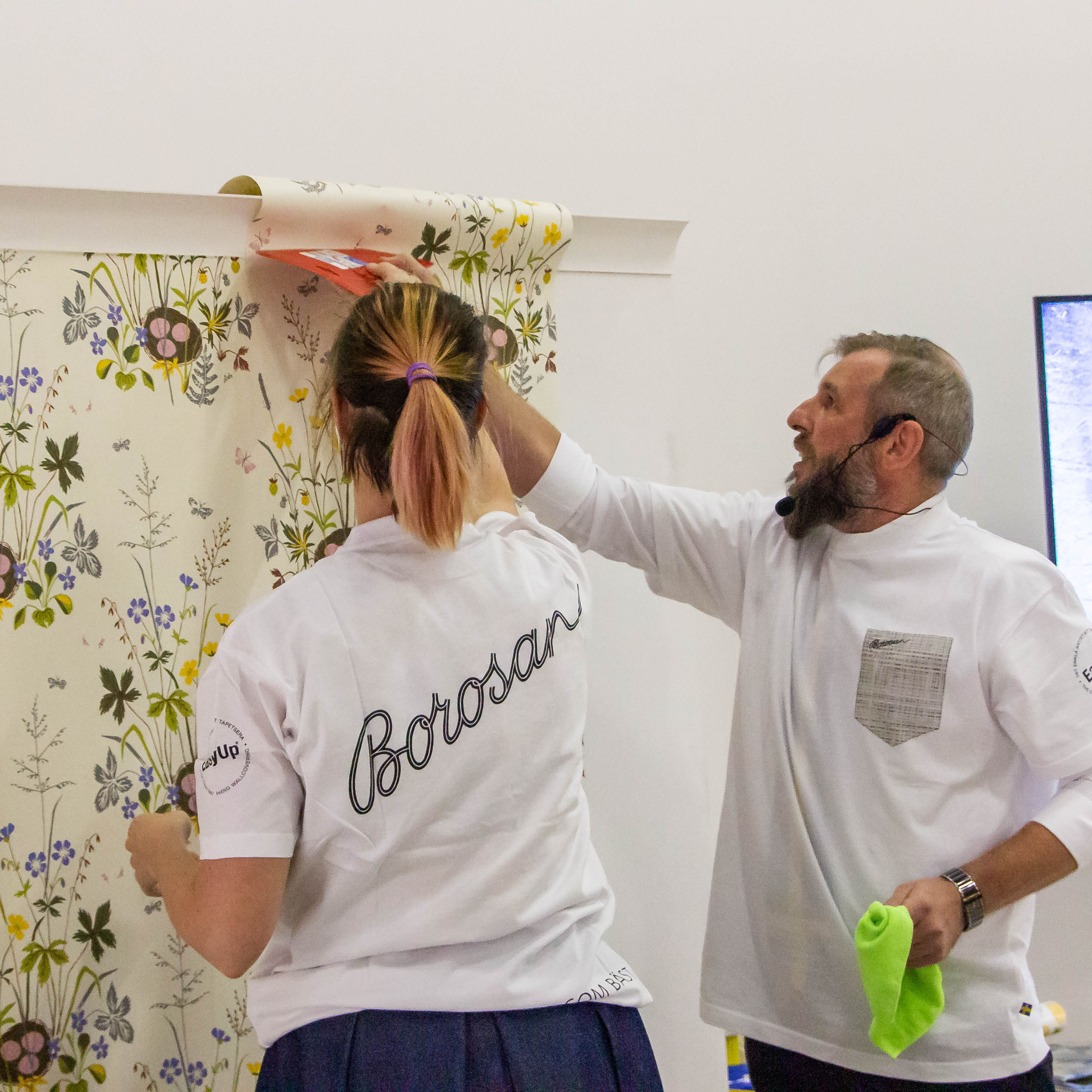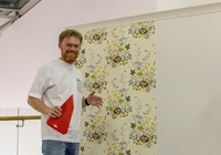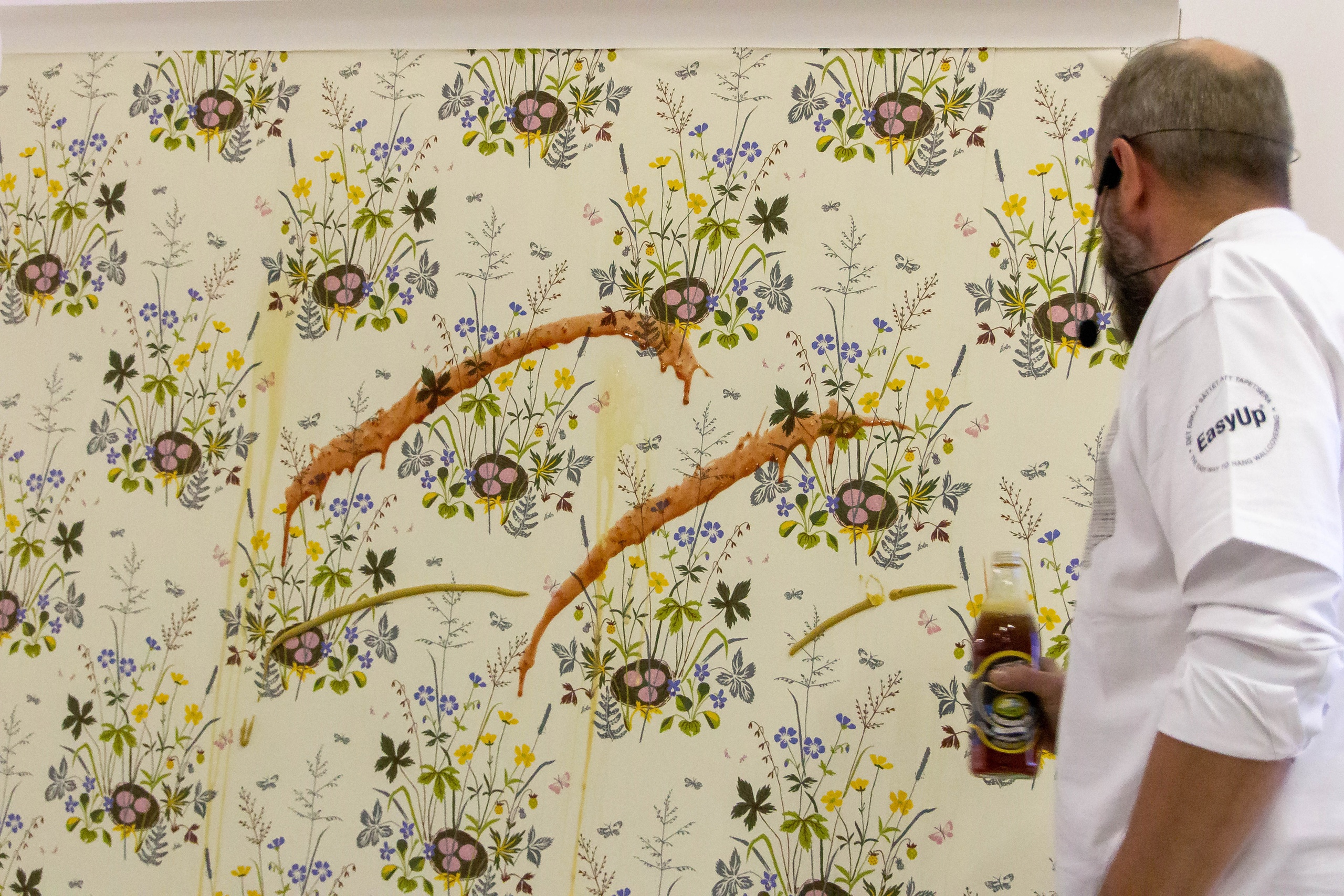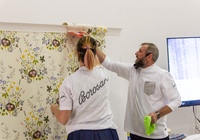 После небольшой лекции, директор ODesign давал мастер-класс по монтажу обоев Borastapeter из новой коллекции. Итак, мы научились клеить обои, пора попытаться испортить их! Свеженаклеенные полотна были испачканы помадой, кофе и кетчупом. Загрязнения легко удалились влажной мягкой губкой, а главное рисунок остается в первозданном виде.